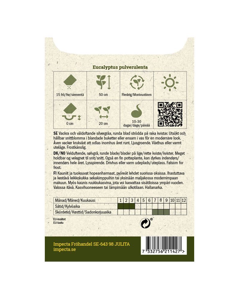 Vakre og velduftende, runde blader i sølvgrått som sitter spredt på rette kvister. Utsøkt og holdbar snittblomst, fin i blandede buketter. Gir en moderne stil for seg selv i en vase. Kan også dyrkes innendørs året rundt som en vakker potteplante.Dyrking fra frø:Forkultiveres innendørs i såjord. Lysspirende. Fukt jorden før såing. Frøene trykkes lett ned i overflaten. Dekkes med klar plast utstyrt med luftehull, eventuelt kan pottene luftes regelmessig. Settes i 20–25 °C, lyst og noe svalere etter spiring. Plantes ut etter herding når faren for frost er over. Til varme uteforhold, drivhus eller liknende.