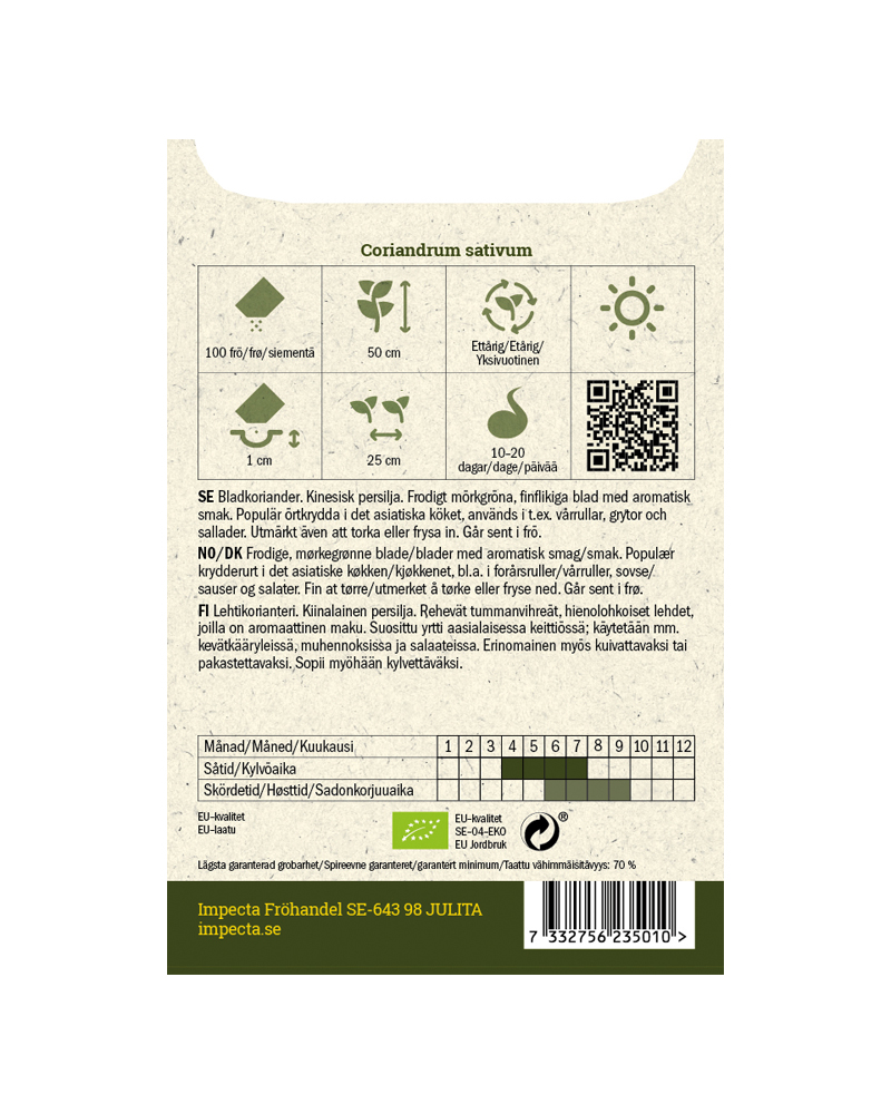 Bladkoriander. Kinesisk persille. Frodige, mørkegrønne blader med små fliker og aromatisk smak. Populær krydderurt i det asiatiske kjøkken. Brukes i bl.a. vårruller, gryteretter og salater. Også velegnet til tørking og frysing. Går sent i frø.Dyrking fra frø:Direktesås på friland når jorden er klar. Vann jorden før såing. Hold jorden fuktig i spiringsperioden. Sås i omganger for god tilgang gjennom hele sommeren. Høstes fortløpende. Selvsår seg lett.