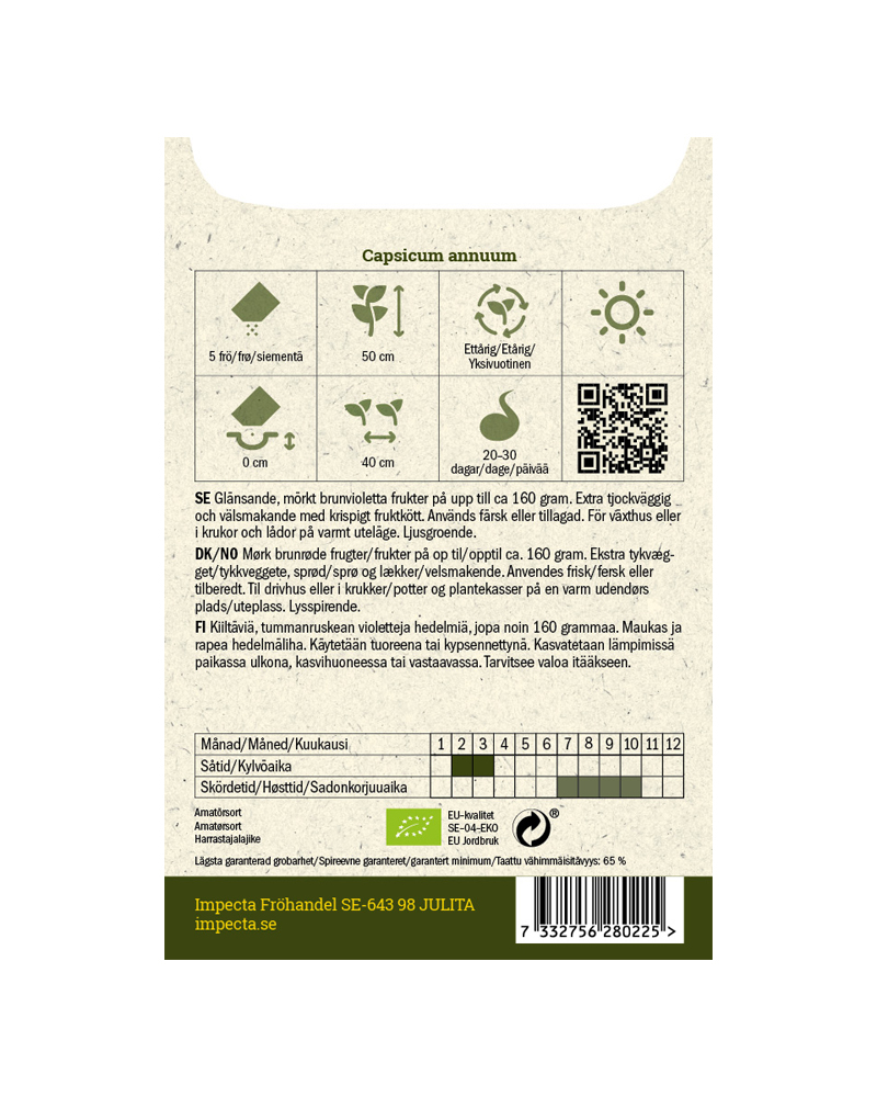 Blanke, mørkt brunfiolette frukter på opptil ca. 160 gram. Velsmakende med ekstra tykke vegger og sprøtt fruktkjøtt. Brukes ferske eller til matlaging. Til drivhus eller potter og kasser under varme uteforhold.Dyrking fra frø:Forkultiveres innendørs i såjord. Lysspirende. Fukt jorden før såing. Frøene trykkes lett ned i overflaten. Dekkes med klar plast utstyrt med luftehull, evt. kan pottene luftes regelmessig. Settes i 20–25 °C, lyst og noe svalere etter spiring. Plantes ut etter herding når faren for frost er over. Til varme uteforhold, drivhus e.l.