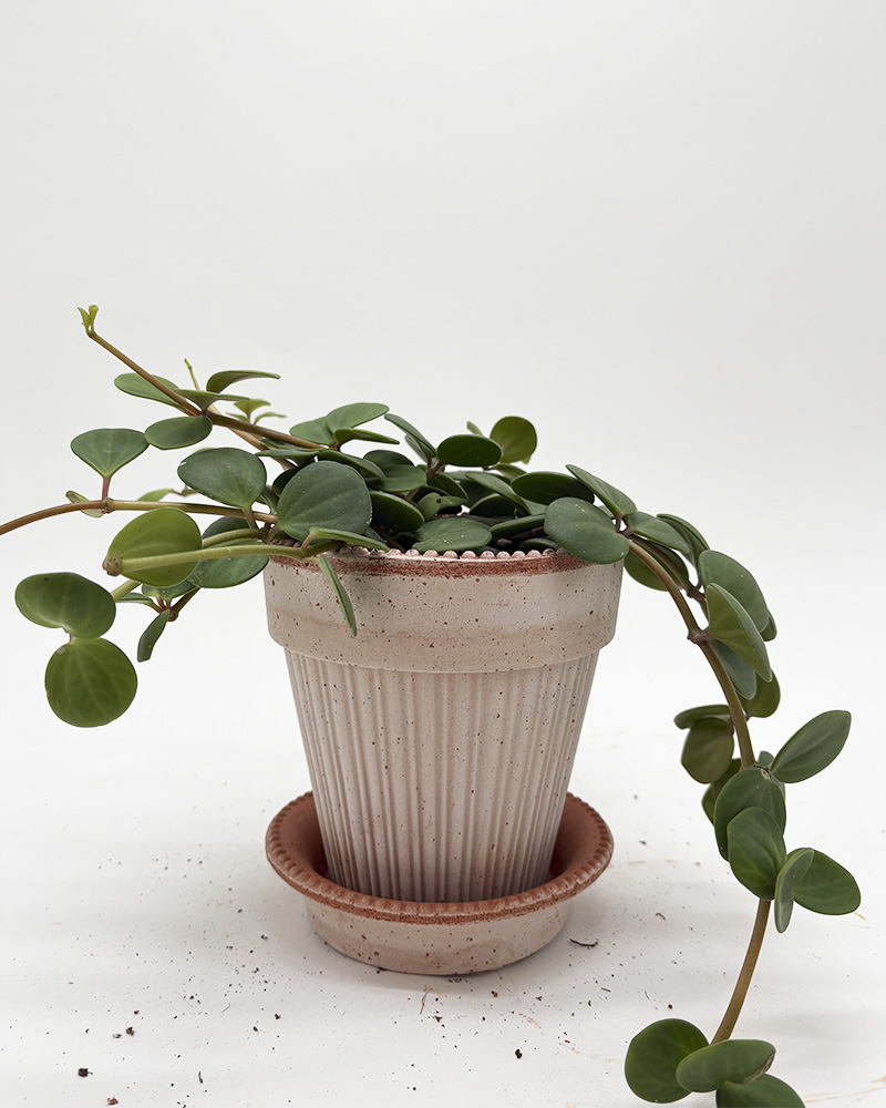 Peperomia prostrata, også kjent som 'String of Turtles, er en sjarmerende grønn inneplante med små, runde blader med vakre mønstre som minner om skilpaddeskall. Den er lettstelt og trives i lys uten direkte sol. Vann moderat og la jorden tørke lett mellom hver vanning. Med sitt hengende vekst og unike bladverk er den perfekt for hyller, ampler og små rom.