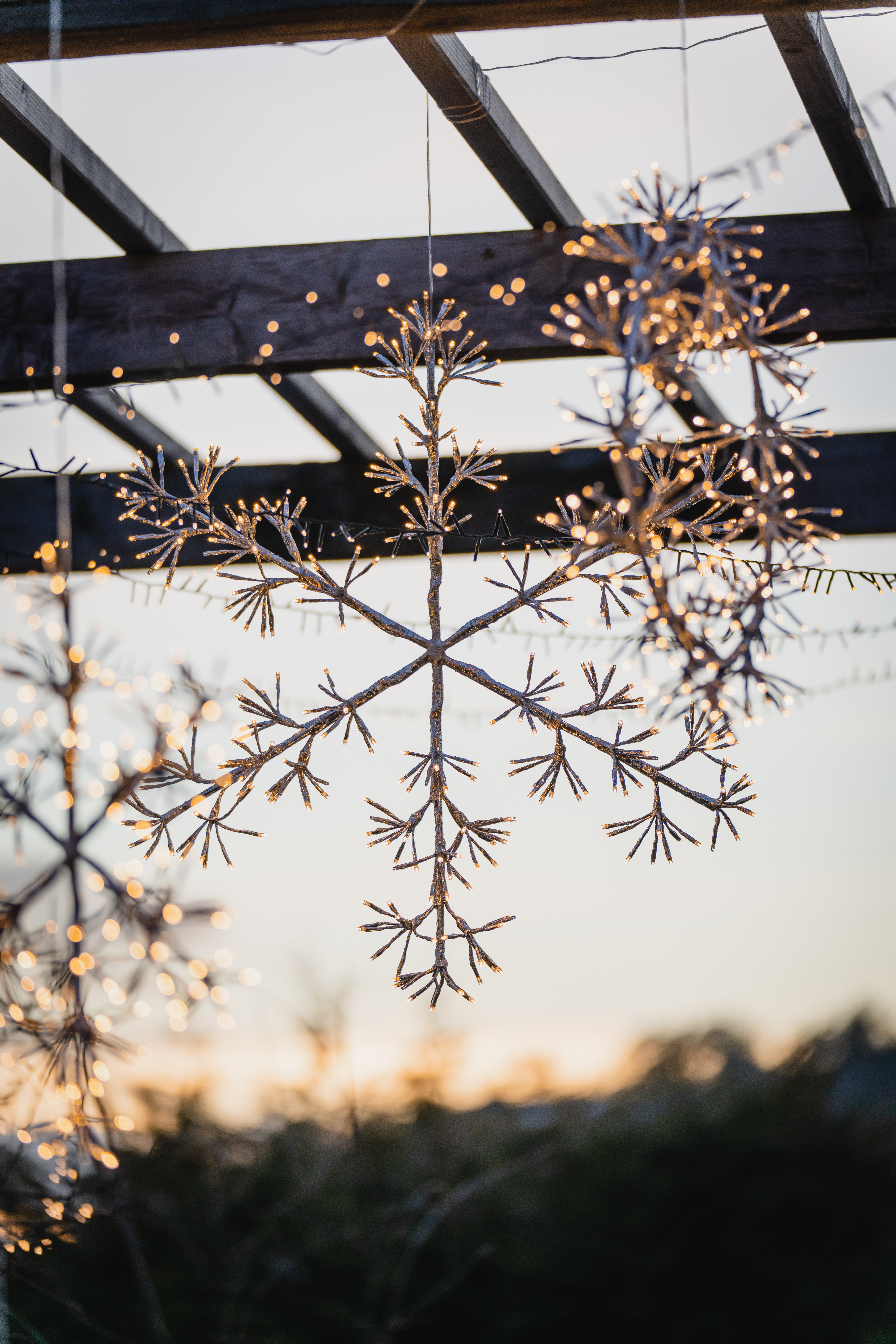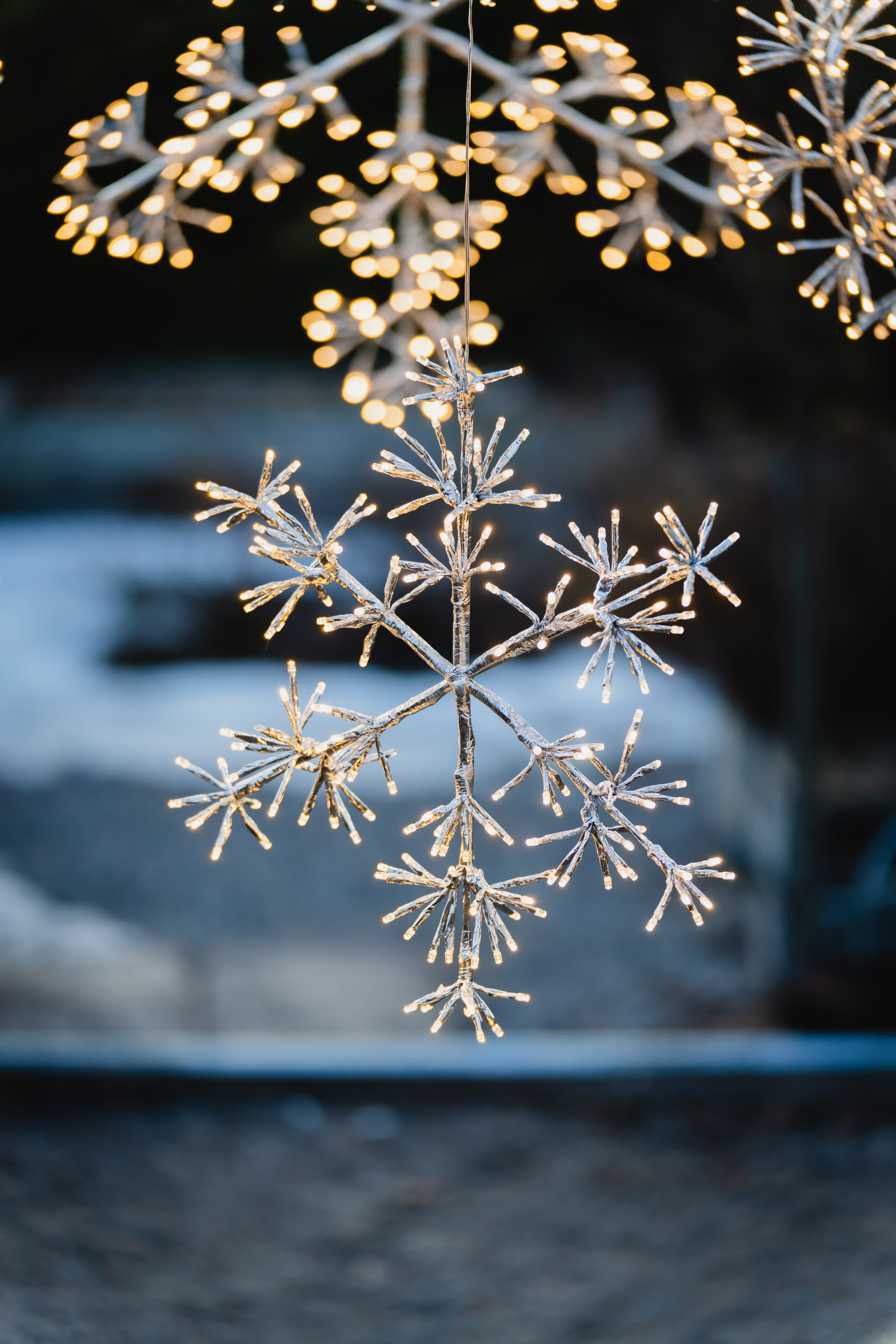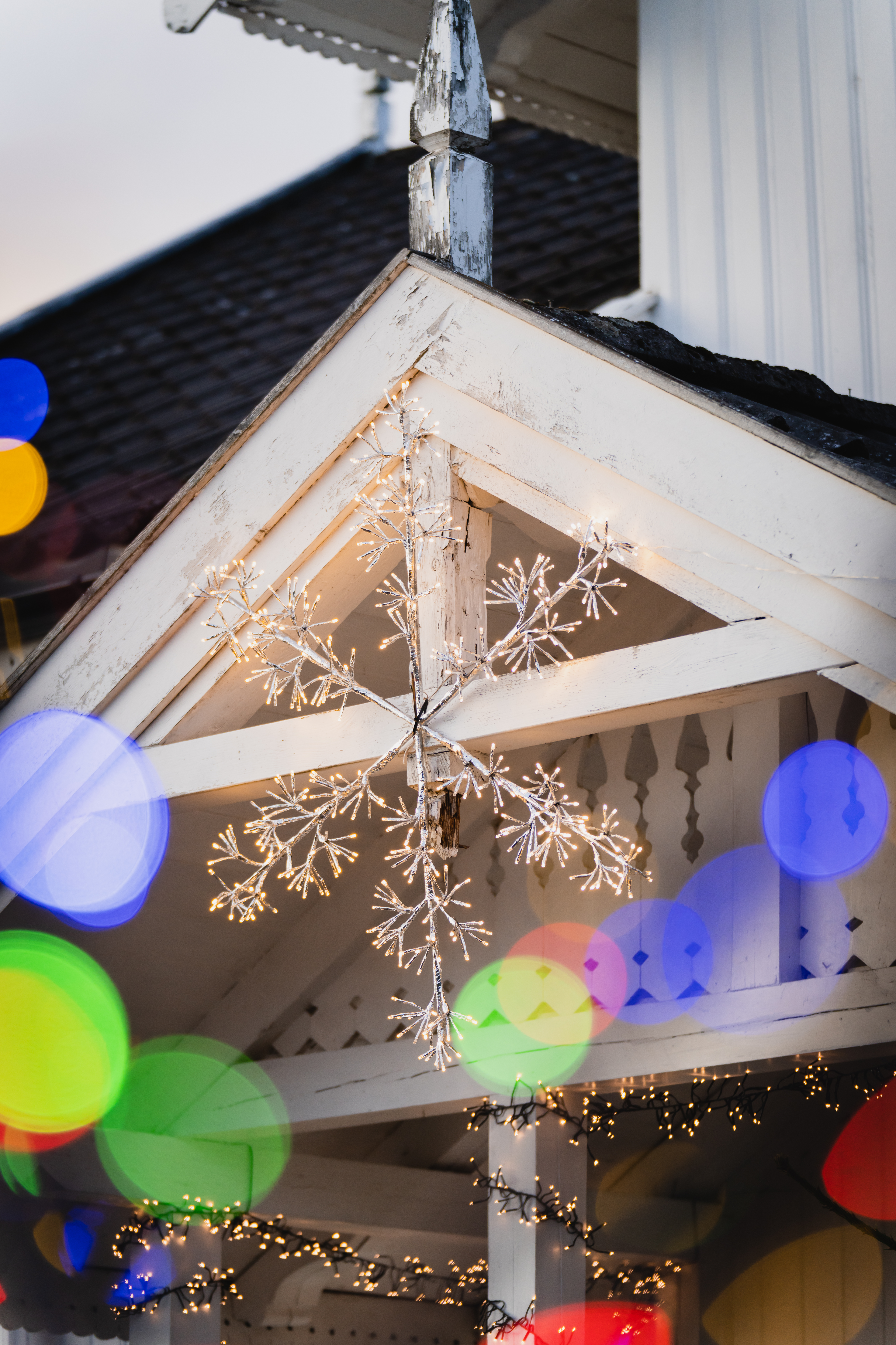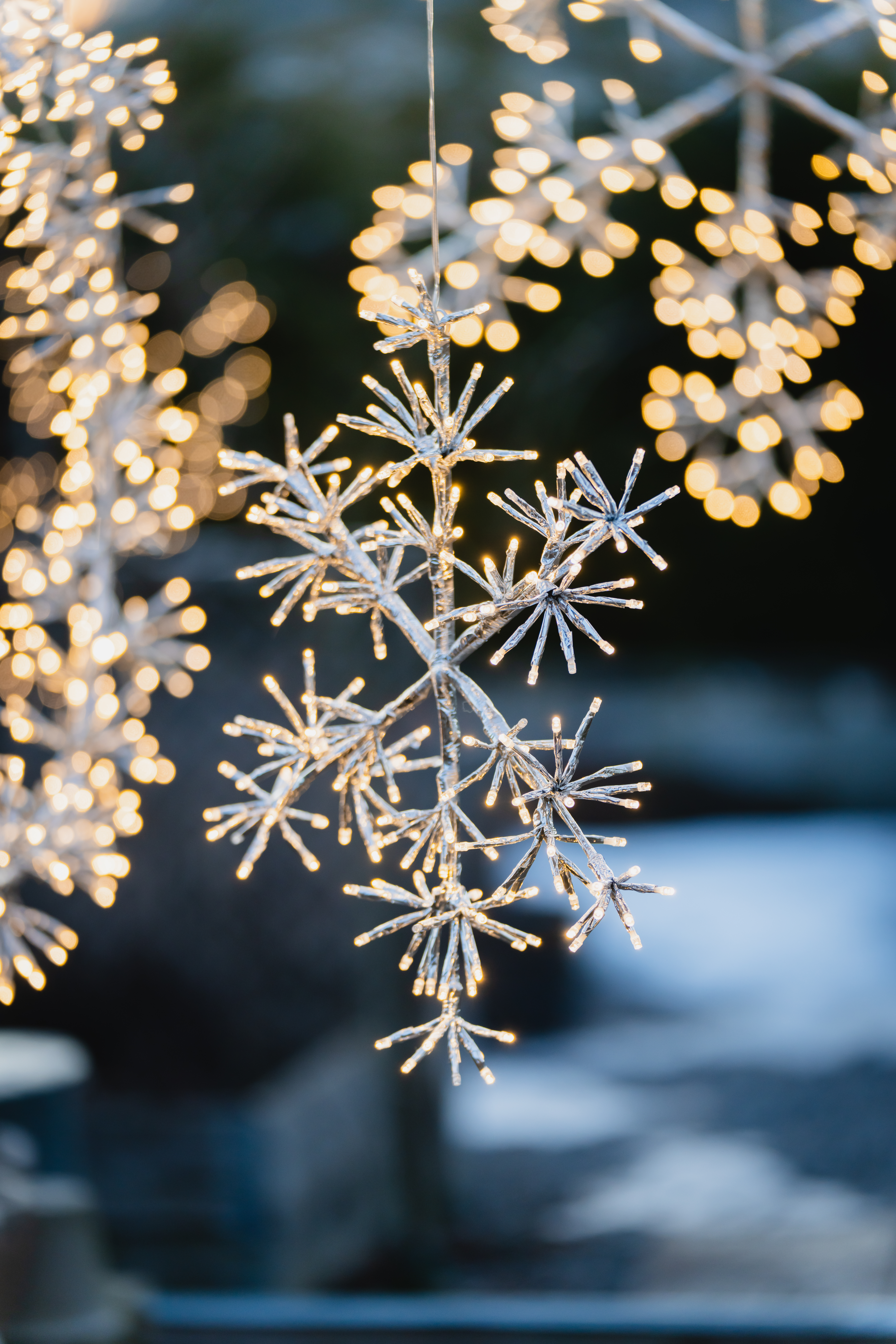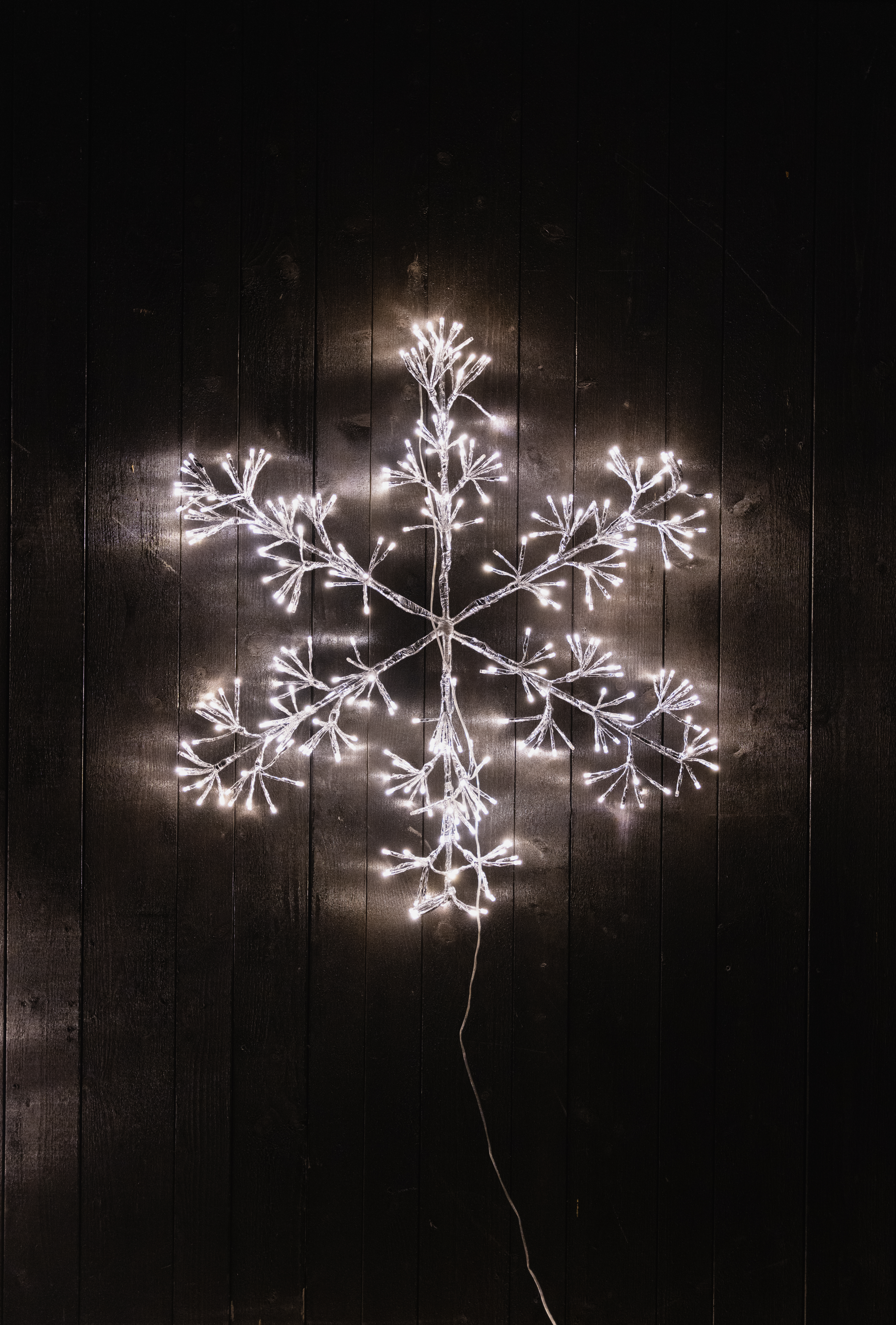 Vakker julebelysning, formet som en snøkrystall med 192 glitrende LEDlys. Støpsel med 5 meter ledning. Med timer (8 timer på/16 timer av). Til innendørs og utendørs bruk.